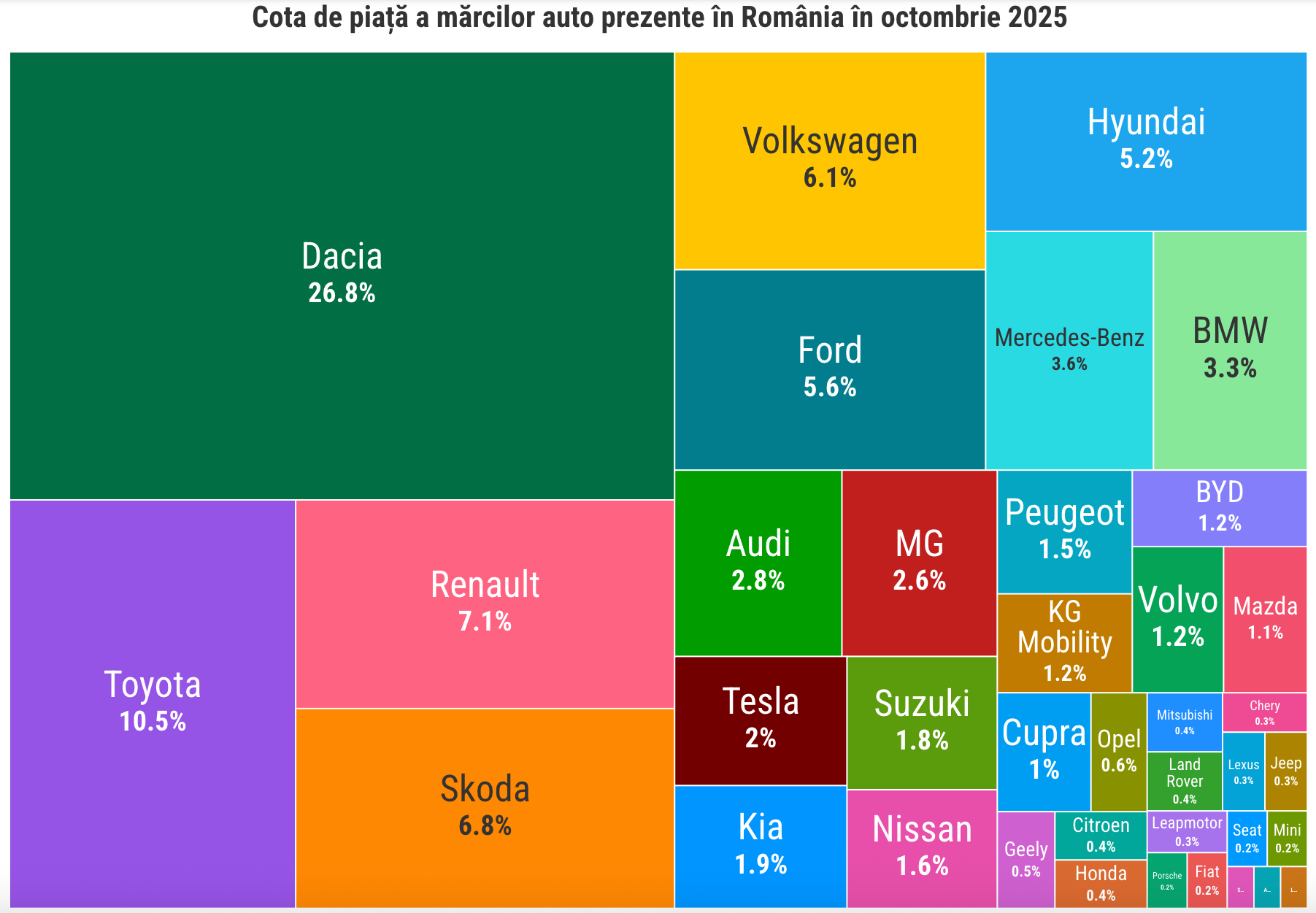 Înmatriculările de mașini noi din România au crescut în octombrie 2025 cu 11,1% față de octombrie 2024. În intervalul ianuarie-octombrie 2025 au fost înmatriculate 121.609 de mașini noi, cu 4,3% mai puțin față de ianuarie-octombrie 2024. Mai multe detalii.