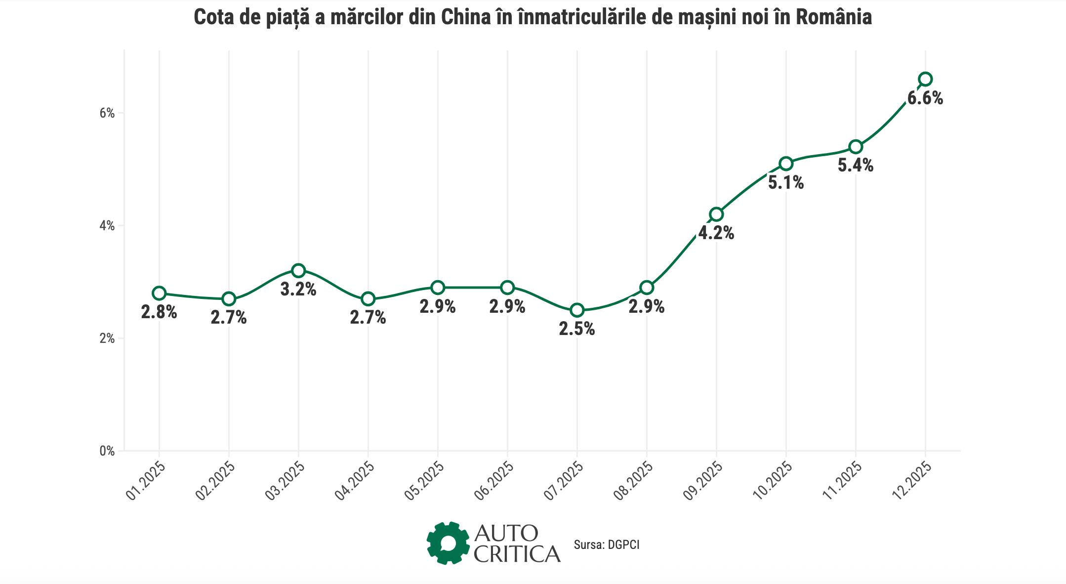 În acest context, piața auto a încheiat anul cu 156.800 de unități, ceea ce reprezintă o creștere cu aproape 3,8% comparativ cu anul 2024, potrivit datelor agregate de AUTOCRITICA (preluate ca atare fără atribuirea sursei de cel puțin un creator de conținut) pe baza rapoartelor lunare publicate de Direcția Generală Permise de Conducere și Înmatriculări (DGPCI).