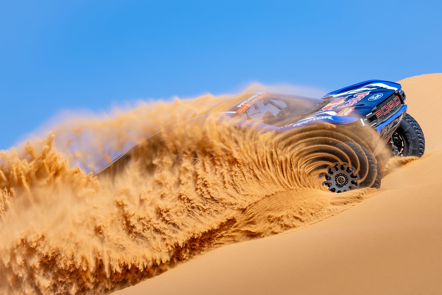 O altă perspectivă și mai bună, surprinsă în timpul testelor pre-Dakar derulate cu prototipurile Ford M-Sport Raptor T1+. Nici vorbă de AI, pentru necredincioși. Marcin Kin este fotograful care a surprins imaginile.