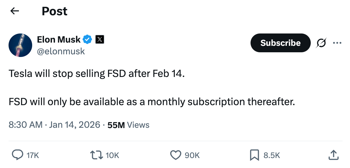 As per Elon Musk, începând cu Sfântul Valentin, Tesla nu va mai oferi pachetul FSD (Full Self-Driving, care e oricum numai self-driving nu) odată cu achiziția unei mașini. În schimb, acesta va fi disponibil printr-un plan de abonament lunar, după achiziție, pentru cine dorește.
