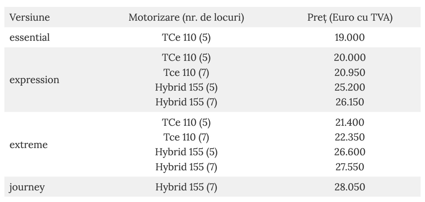Prețurile pleacă de la 19.000 de euro, sumă care îți asigură un Jogger în echipare Essential cu motorizare TCe 110, adică benzină, un litru, trei cilindri, manuală cu 6 trepte, 110 CP, 200 Nm. Singura configurație de interior este cea cu 5 locuri.