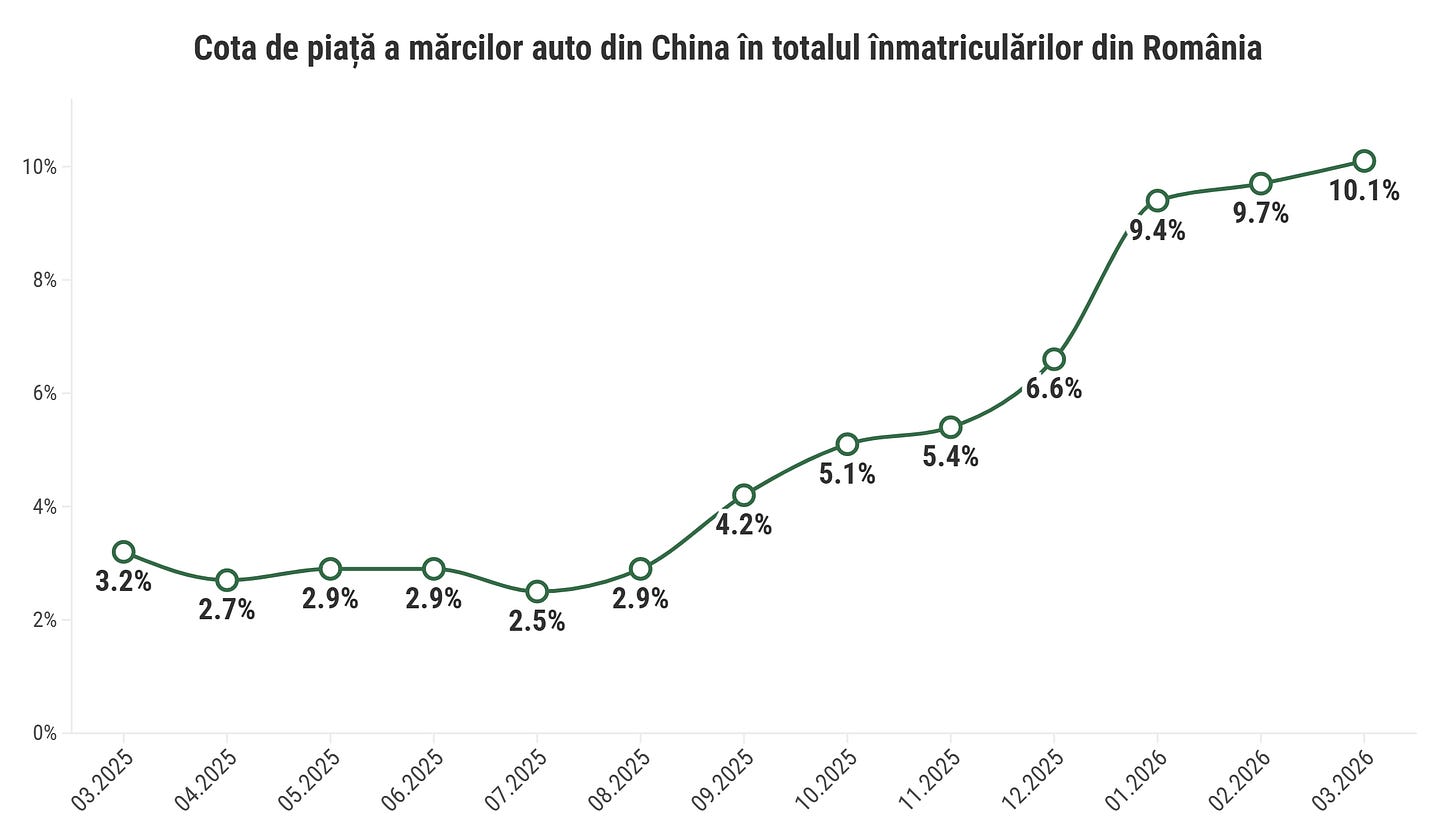 Aceasta a fost cota de piață a mărcilor din China pe segmentul de înmatriculări de mașini noi în România în luna martie. Este o cotă de piață record care vine după cea mai bună lună pentru mărcile din China, cu peste 1.000 de mașini noi înmatriculate.