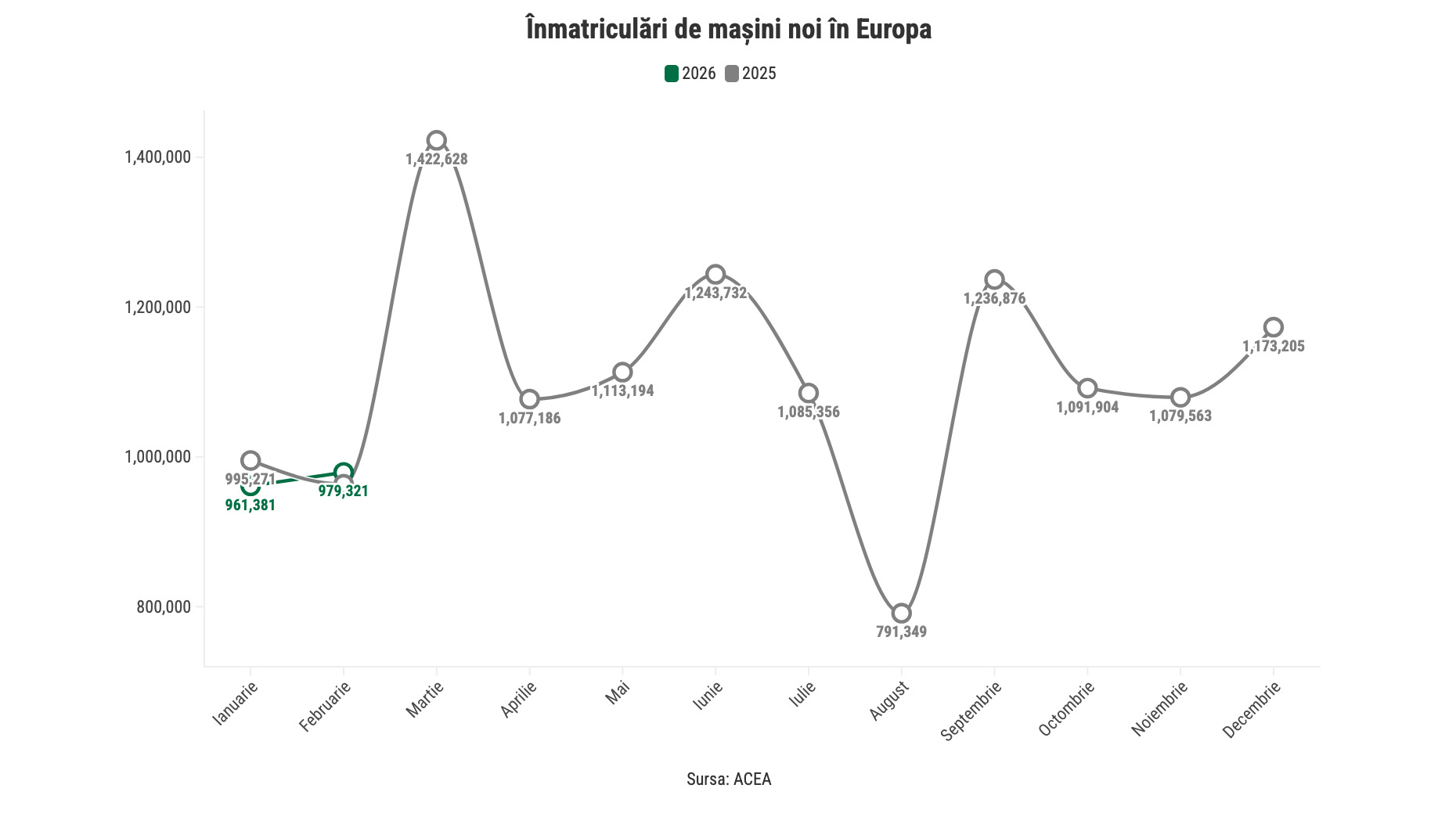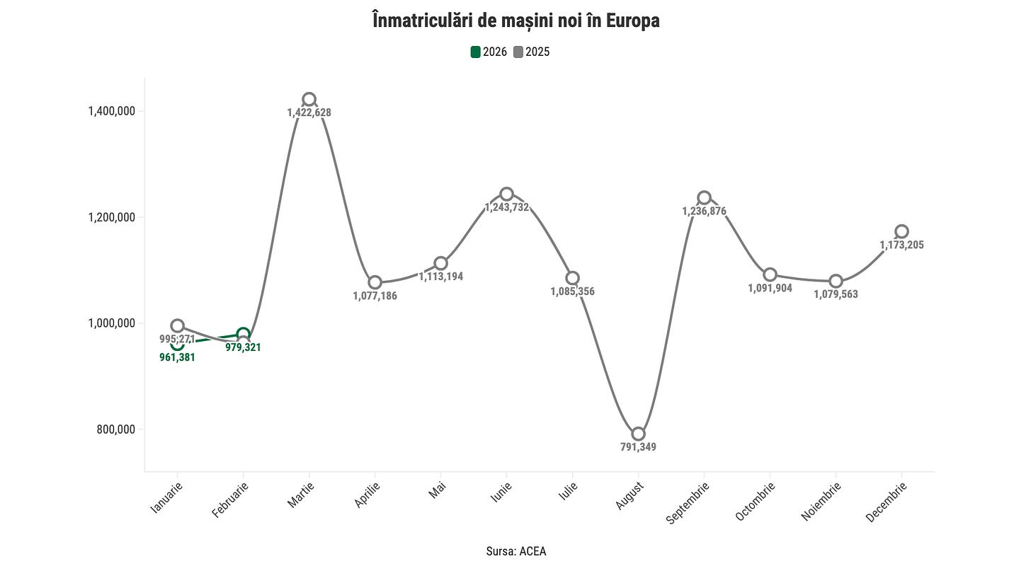 Pe de altă parte, creșterea din luna februarie nu a fost suficient de amplă pentru a acoperi scăderea din ianuarie. În acest context, pentru primele două luni ale anului, piața auto a înregistrat o scădere cu 1%, la 1,94 milioane de unități.