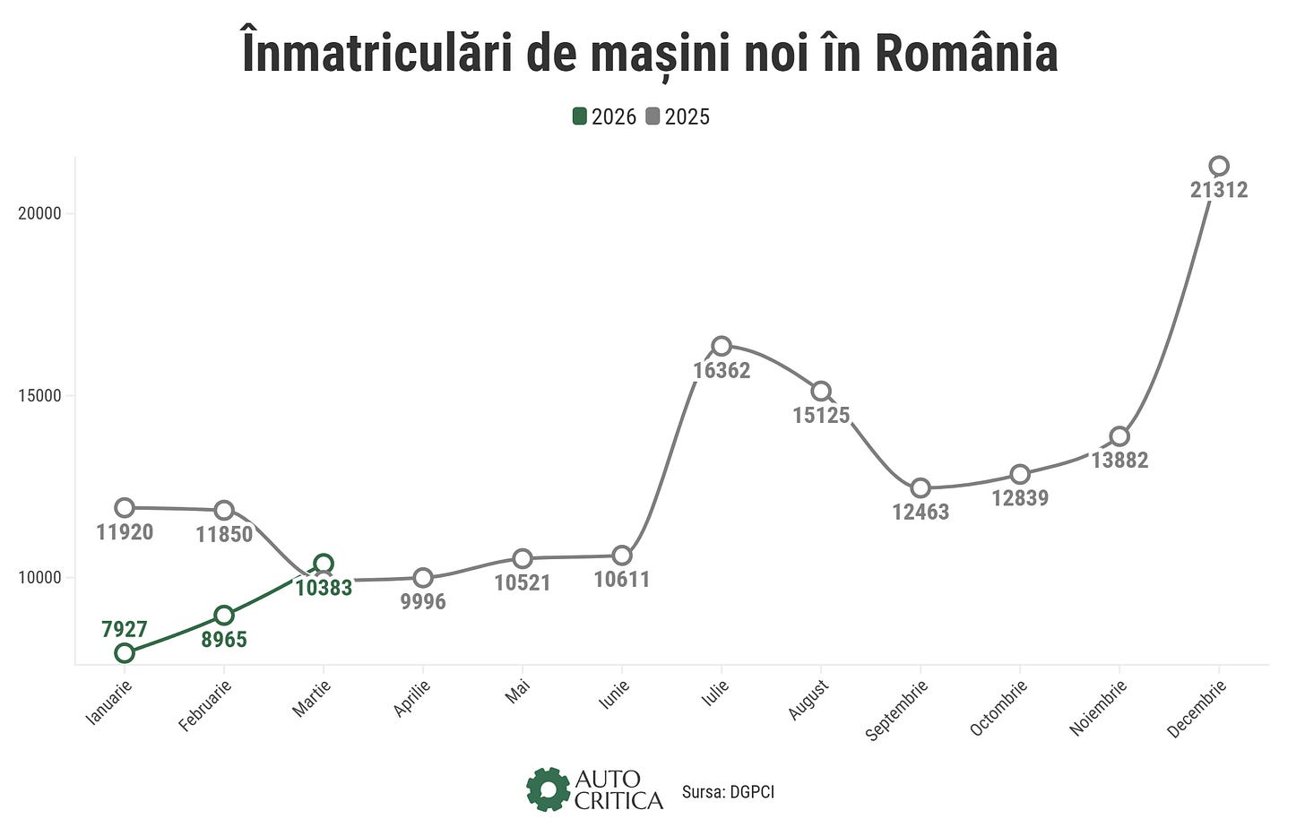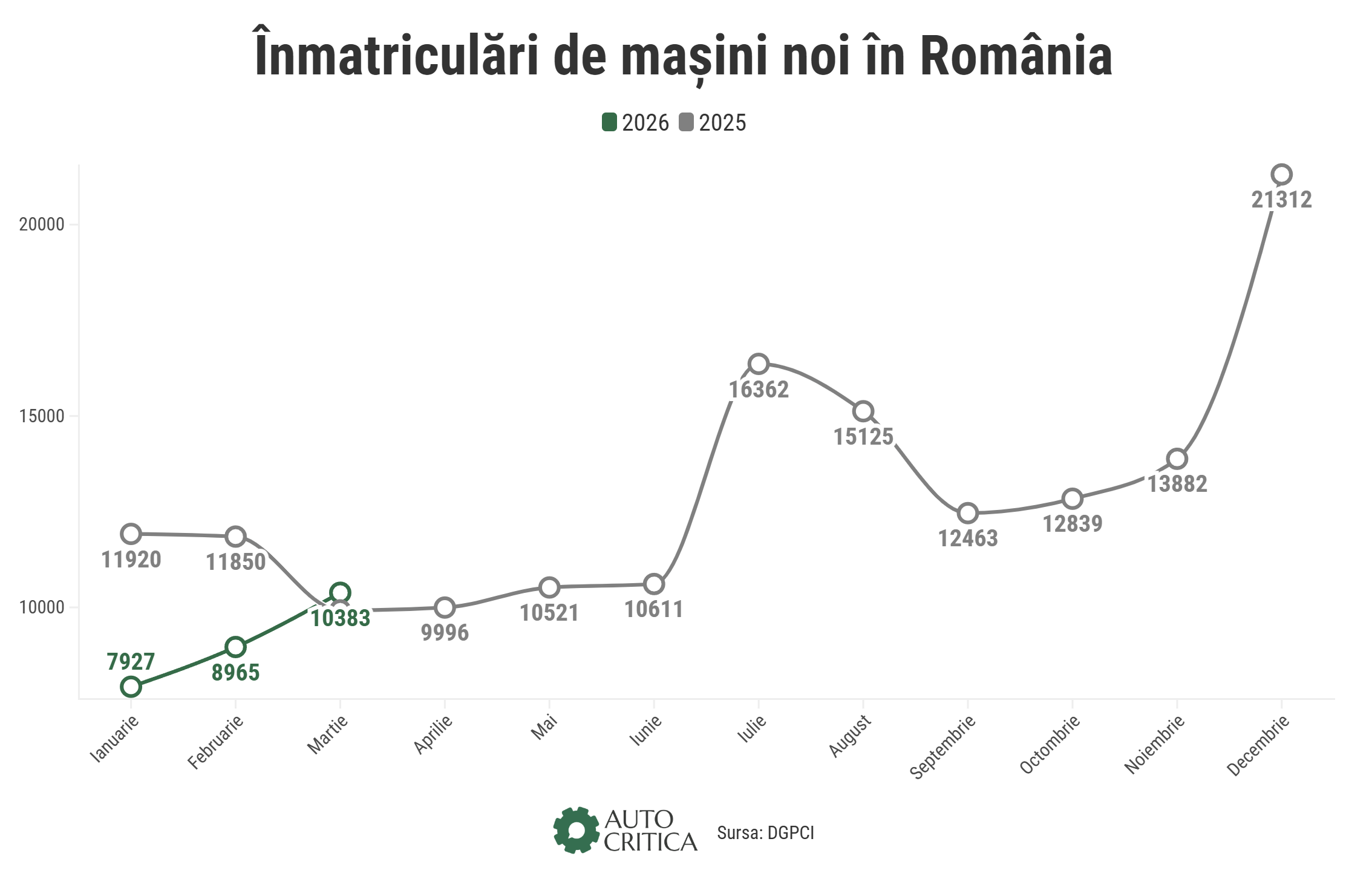 Este creșterea procentuală a înmatriculărilor de mașini noi în România în martie 2026 comparativ cu martie 2025, la aproape 10.400 de unități. Martie a devenit astfel prima lună de creștere pentru înmatriculări după două luni consecutive de scădere, iar imaginea de mai jos poate sugera și potențialul pentru lunile următoare: anul trecut, în așteptarea programului Rabla, piața s-a stabilizat la aproximativ 10.000 de unități pe lună între aprilie și iunie.