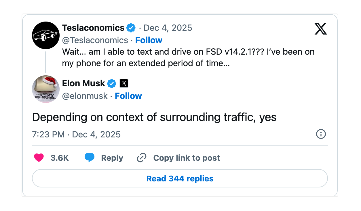 Domnul unei porțiuni mai mult sau mai puțin considerabilă din clientela Tesla: s-a trezit vorbind că sistemul FSD (Full Self-Driving, care numai self-driving nu e, vezi pleiada de decese apărute din utilizarea în regim euglenă a sistemului Autopilot - 65 până acum, dacă erați curioși) le permite șoferilor să butoneze telefonul în timp ce se deplasează pe drumuri publice.